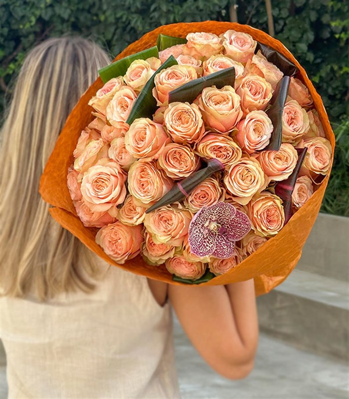 50 adet ekvatordan ithal somon renkli güller, tek orkide ve yeşillikle dizayn edildi