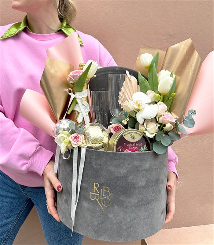 özel olarak seçtiğimiz alkolsüz bir şampanya, taze Ribbon çiçekleri, iki adet şampanya kadehi, Cavendish Harvey bonbon şeker, küre pileksi içerisinde gold renk üzüm ve fındıklı çikolata, ve dekoratif bir kutu yer almaktadır. Şık ve özel tasarım kutumuz, hediye paketinizin zarif bir şekilde sunulmasını sağlayacaktır.