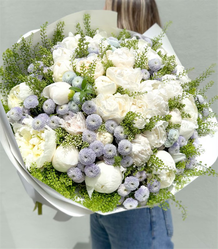 30 adet beyaz ithal şakayık, çok özel lila krizantemler ve mevsim yeşillikleri ile hazırlanan Royal Deluxe Beyaz 30 Şakayık Buketi ile sevdiklerinize rüya gibi bir hediye verin.