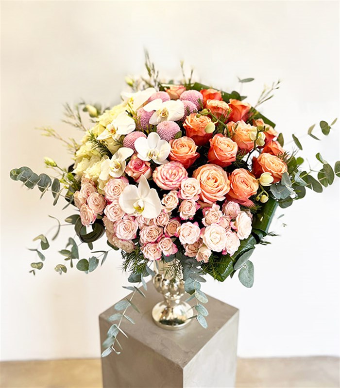 Gümüş ayaklı grand vazo içerisinde ithal somon ve beyaz ekvator gülleri, pembe çardak gülleri, beyaz orkide kandilleri ve okaliptuslar ve yeşil yapraklarla dizayn edilmiştir.