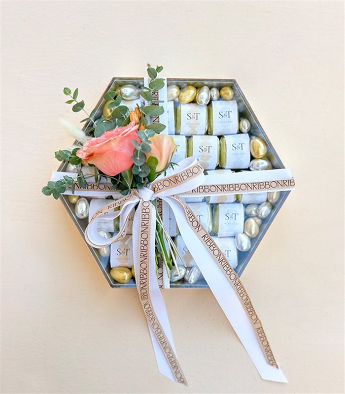 Şık altıgen grand deluxe ayna tepsi içerisinde 24 adet, isme özel dizayn edilmiş fındık dolgulu luxe çikolata ve yaklaşık 35-40 adet gold kaplı badem drajelerden dizayn edildi.