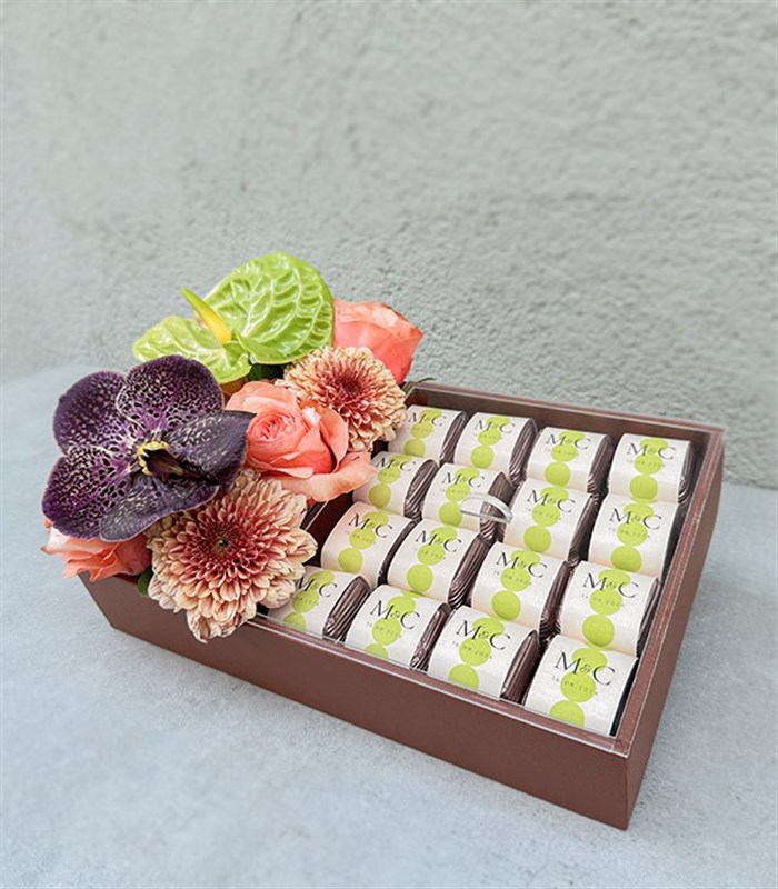 İthal kahala güller, kahverengi anastasya çiçekleri, yeşil antoryum, mor vanda orkide ile dizayn ettiğimiz kahverengi vegan deri tepsi içerisinde isme özel dizayn edilmiş fındık dolgulu ve üzümlü luxe 32 adet çikolata bulunmaktadır.