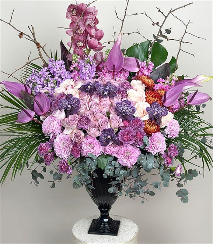 Siyah grand cam ayaklı vazo içerisinde; lüks ithal lila ve pembe ekvator gülleri, ithal pembe çardak güller, ithal mor ve pembe vanda orkideler, ithal anastasyalar, ithal mor antoriumlar ve pembe mor minik çiçekler(mevsime göre kuru mor pembe çiçekler de kullanılabilir) ve yeşillikleri bulunmaktadır.