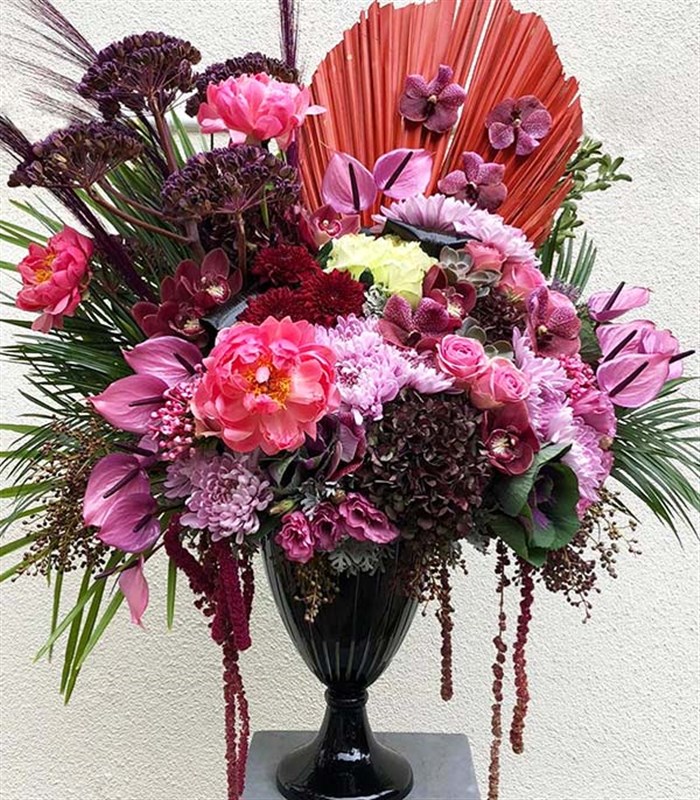 Siyah grand cam ayaklı vazo içerisinde; lüks ithal pembe ekvator gülleri, ithal pembe çardak güller, ithal mercan(fuşya) şakayıklar, ithal mor ve bordo vanda orkideler, ithal anastasyalar, ithal mor antoriumlar, yelpazeler, tüyler, amarantuslar ve pembe mor minik çiçekler(mevsime göre kuru mor pembe çiçekler de kullanılabilir) ve yeşillikleri bulunmaktadır.