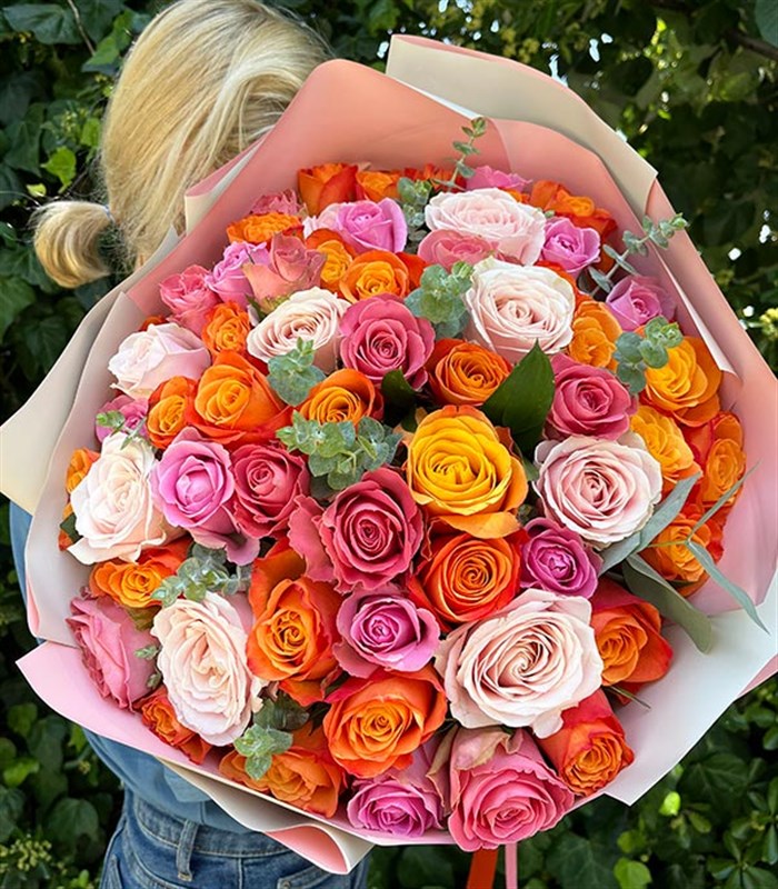 Grand Deluxe Pembe Turuncu Güller Buketi içerisinde 60 adet turuncu pembe karışık tonlarda özel ekvator gülleri bulunmaktadır ve Ribbon Flowers özel tasarım kağıdına sarılacak gönderilecektir.