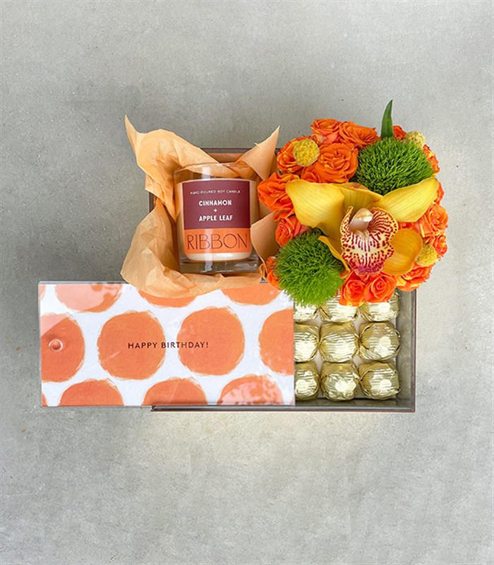 Happy Birthday Turuncu Hediye Kutusu canlı ve enerji rengi ile gönüllerde taht kurmayı başarıyor. Capcanlı çiçekleri ve Ivy Blossom kokulu mum hediye ile eşsiz bir hediye olan bu kutunun içerisindeki çikolata da gören herkesi kendine hayran bırakacaktır. Bu doğrultuda siz de Ribbon Flowers ayrıcalıkları ile en kaliteli hediye kutularını sevdiklerinize hediye edebilirsiniz.