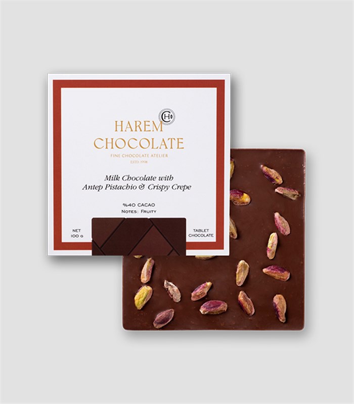 Fıstıklı & Krepli Sütlü Tablet Çikolata Damakta enfes bir tat bırakan sütlü çikolata, krep kırıkları ve Antep fıstığının buluşmasıyla ortaya çıkan eşsiz lezzet.