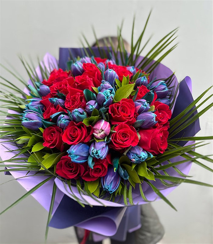 Gösterişli, gözalıcı, özel galaksi laleler ve kırmızı güllerin buluştuğu bu buket ile onu şımart!