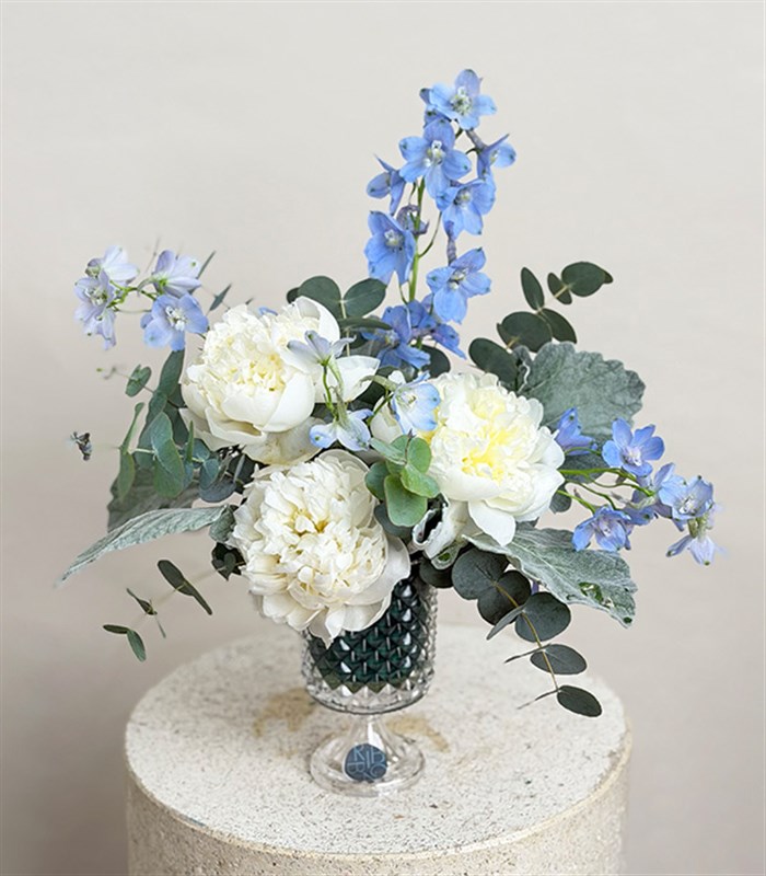 Buz Çiçeği Beyaz Şakayık Mavi Delfinyum Vazo Aranjmanı
