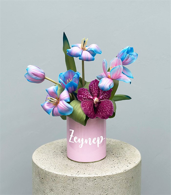 Beyaz boyalı kişiye özel seçtiğiniz galaksi renklerinde isim yazılı vazoda; 6 adet Unicorn Lale, 1 adet pembe leopard vanda orkide ve mor kuru çiçekler bulunmaktadır.