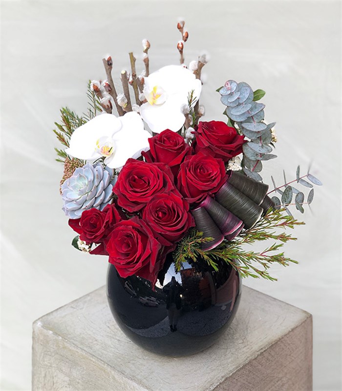 Cam siyah top vazoda, 7 adet akvator kırmızı gül, 2 adet beyaz orkide, 1 adet sukulent, beyaz kuru dallar, okaliptus ve yeşil yapraklarla dizayn edildi.