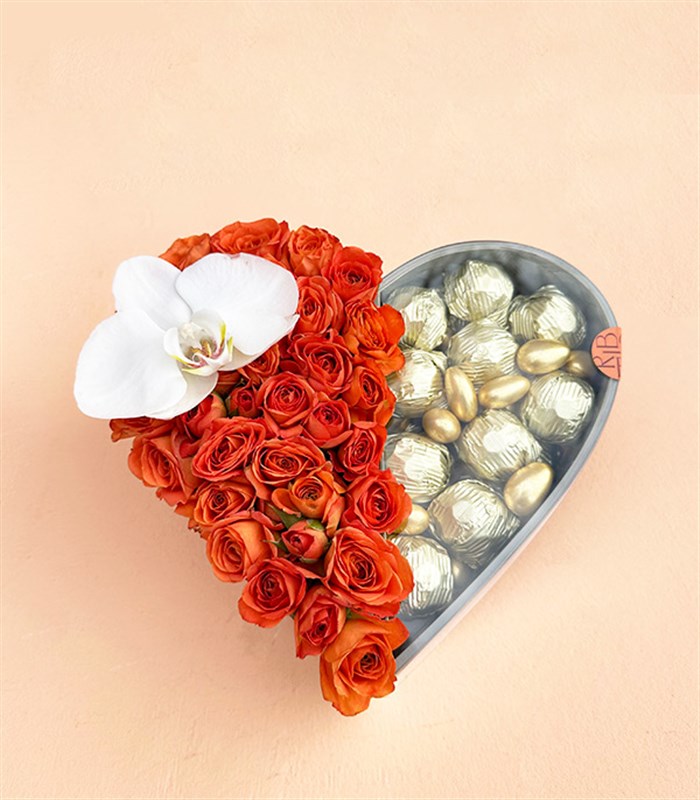 Kalbin yarısı turuncu güllerle bezenmiş, diğer yarısı enfes gold çikolata ile dolu...