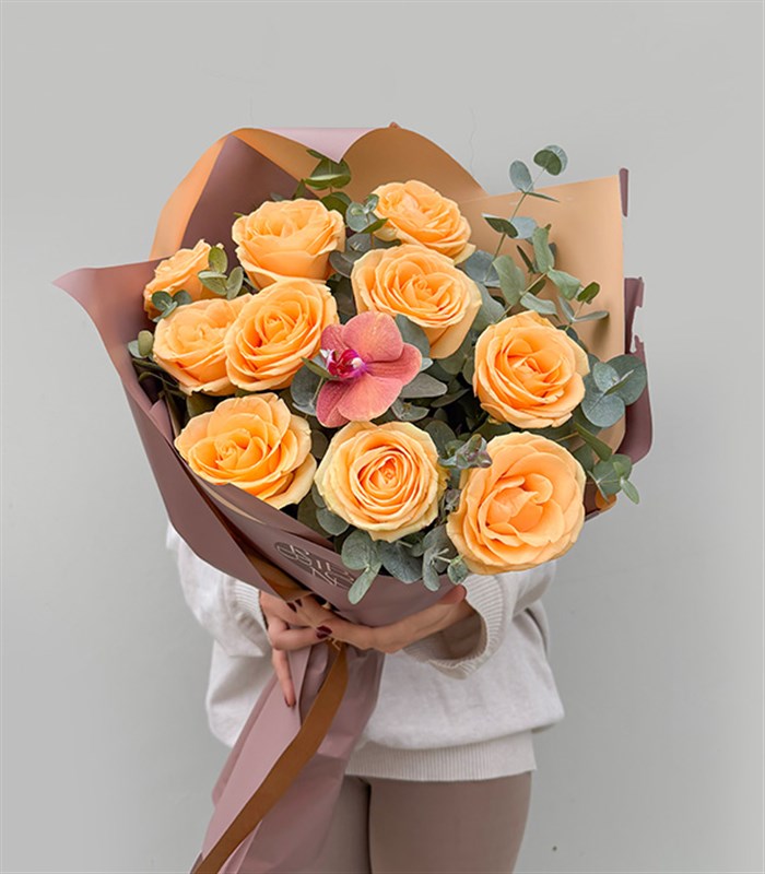 Buketimizin içerisinde, 10 adet ithal kayısı gül, 1 adet nar çiçeği patara orkide, farklı kokulu okaliptüs ile saklamalar bulunmaktadır.