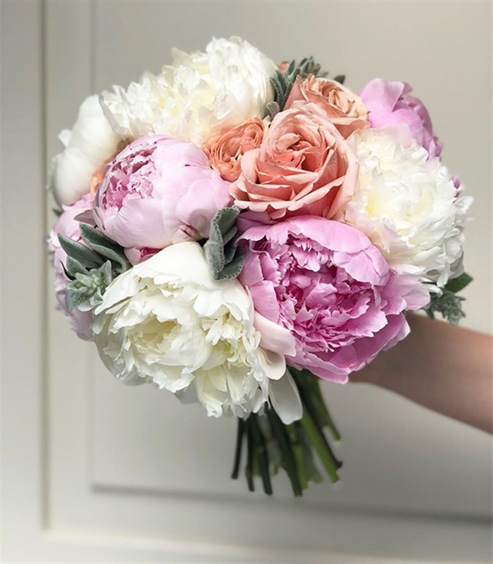 Beyaz pembe şakayıklar ve güllerden gelin buketimiz...