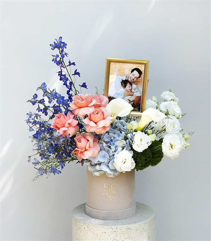 Kişiselleştirilebilir Fotoğraf Çerçeveli Krem Kutuda Çiçek Aranjmanı