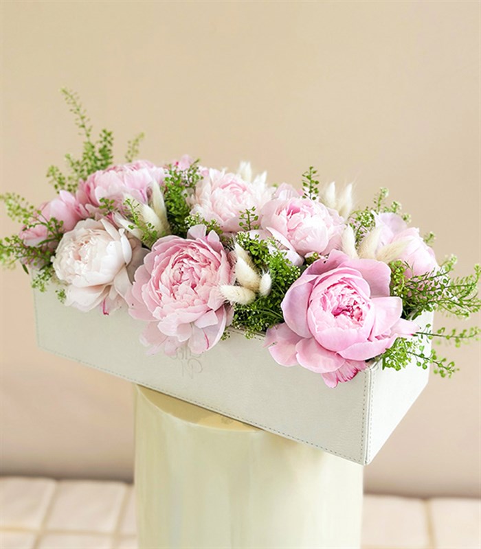 Krem Deri Kutu Pembe Şakayık Aranjmanı