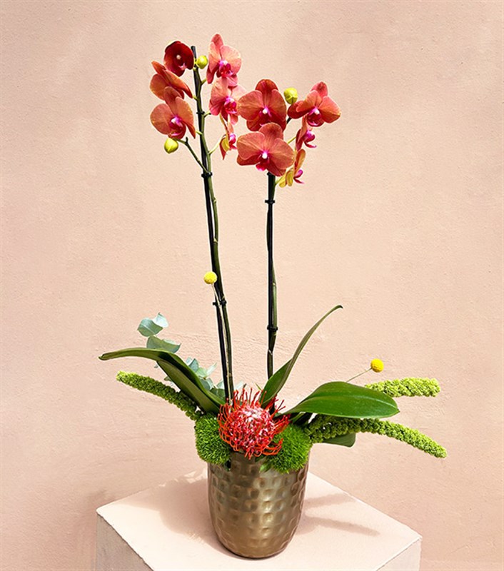 Şık metal gold vazoda; çift dallı narçiçeği orkide, bir adet lucas çiçeği, greentrick yeşillikleri, sarı kraspedialar, okaliptus yaprakları ile hazırlandı.