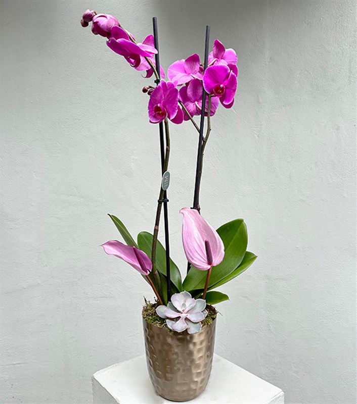 Çift dallı pembe orkide, bir adet sukulent ve iki adet lila antoryum çiçeği ile hazırlandı.