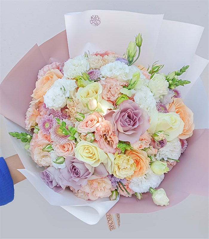 Lila güller, kayısı güller, somon lisyantuslar, çardak güller, lila krizantemler, şebboylar ile hazırlanmış pastel tonlarda oldukça şık bir düzenleme.