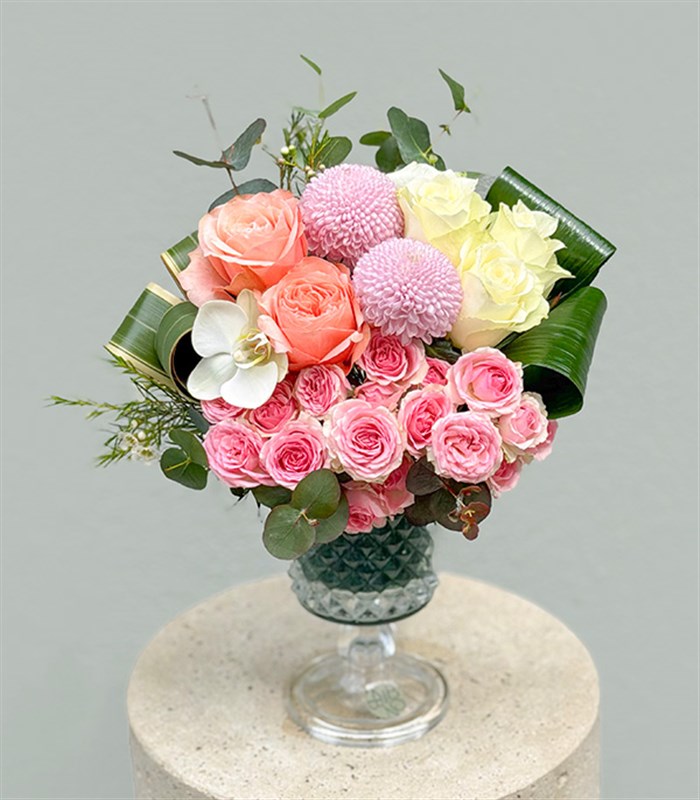 Kadeh şeklinde kristal vazoda 3 adet beyaz gül, 2 adet somon gül, 2 adet anastasya, pembe çardak gülleri ve 1 beyaz orkide ile özenle hazırlanan Leaf, sadeliği zarafetle buluşturuyor.