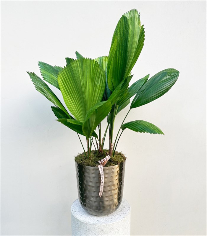 Chrome deluxe saksı içerisinde, Licuala Grandis Kıvrımlı Yelpaze Palmiyesi ekilmiştir.
