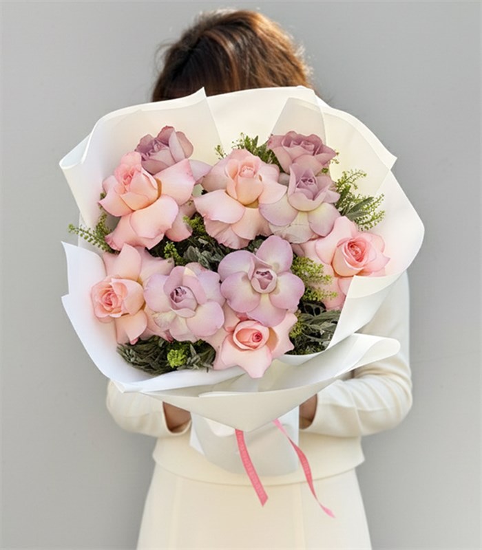 Buketimizin içerisinde, 5 adet ekvator ithal lila gül, 5 adet ekvator ithal pembe gül ile yeşillikler bulunmaktadır.