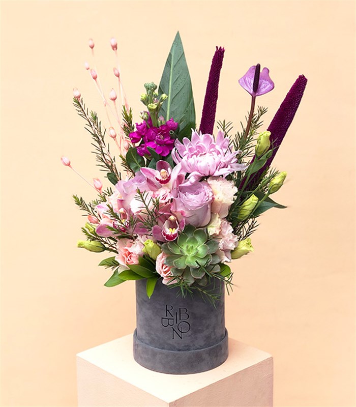Ribbon özel tasarımı mini boy pudra gri renk kadife silindir kutunun içinde yaklaşık 2 adet ekvator lila gül, 2 adet pembe vanda cymbidium orkide, 1 adet anastasya, pembe lisiantuslar, 1 adet mor antorium, 1 adet sukulent, mor şebboy, kuru çiçekler ve yeşil yapraklar bulunmaktadır.