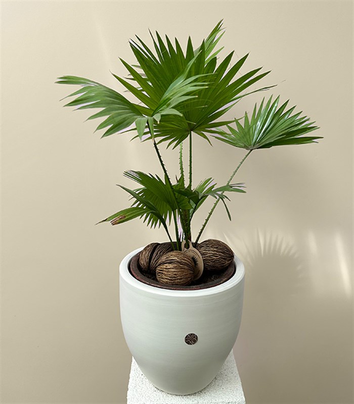 Beyaz seramik saksı içerisinde ekili Livistona Palmiyesi..