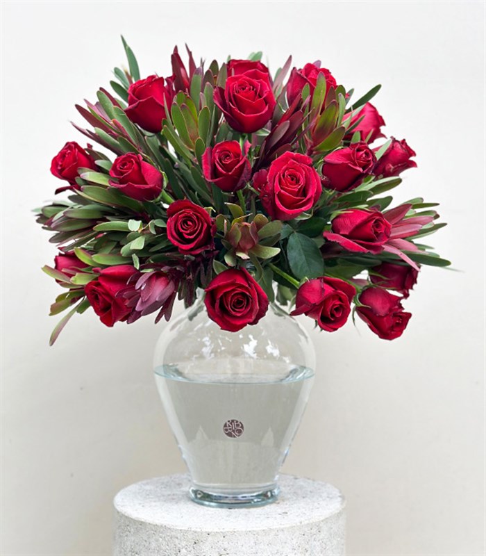 Kırmızı güller, ithal Conebushes bitkisi ile birleşerek aşkınızı dile getiren çok özel bir tasarım oluşturdu...