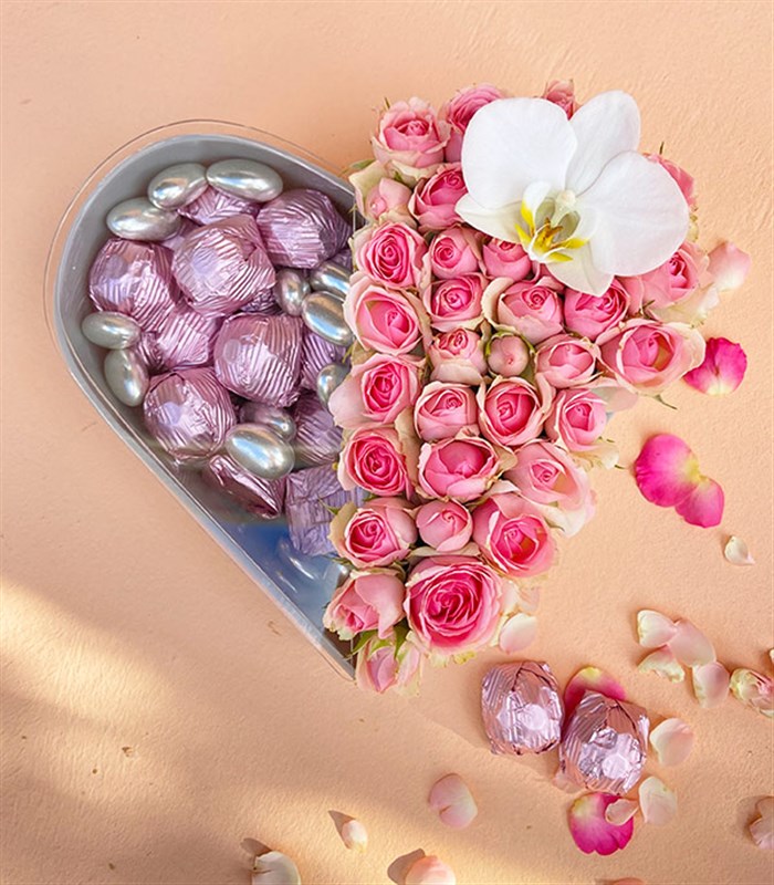 Gri renkte kalp pleksi kutunun yarısında pembe çardak gülleri ve bir beyaz orkide, diğer yarısında 22 adet fındık kremalı pembe sarım sütlü çikolatalar ve gümüş badem drajeler bulunmaktadır.