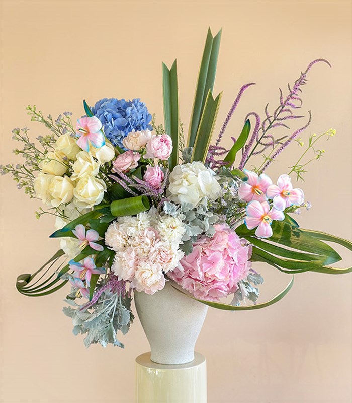 Lullaby in Bloom Seramik Küp Vazoda Puda Şakayık Ortanca Unicorn Lale Deluxe Aranjman