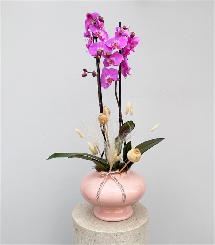 Pudra seramik vazomuzdaki fuşya orkide, kuru çiçekler ile tuzudur.