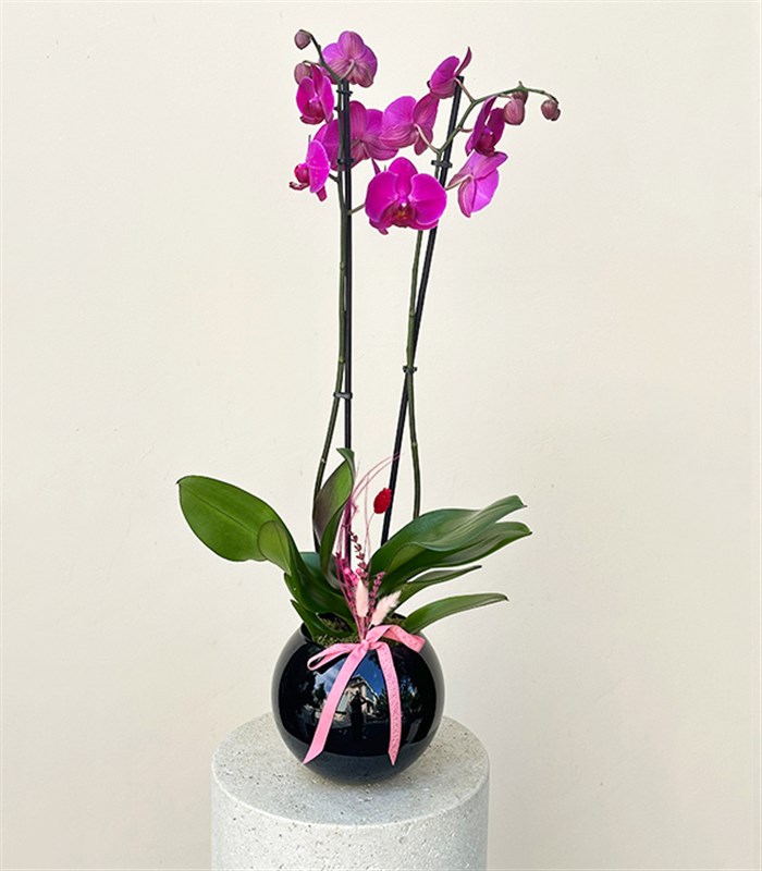 Luxe siyah cam yuvarlak vazo içerisinde iki dal fuşya phalanopsis saksı orkide bulunmaktadır.