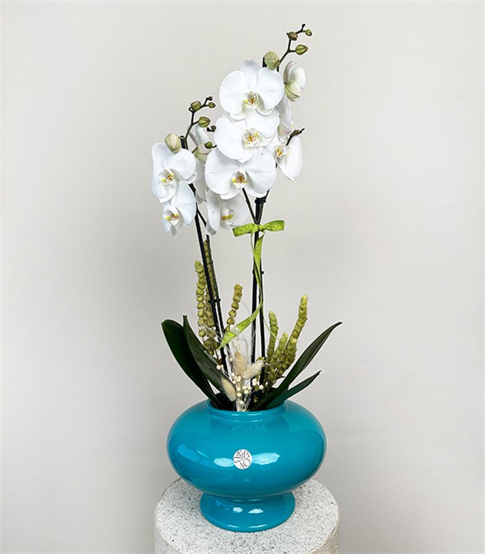 Ribbon'a özel el yapımı turkuaz renkli seramik vazoda beyaz orkideyi sevdiklerinize hediye ederek onları çok mutlu edin.