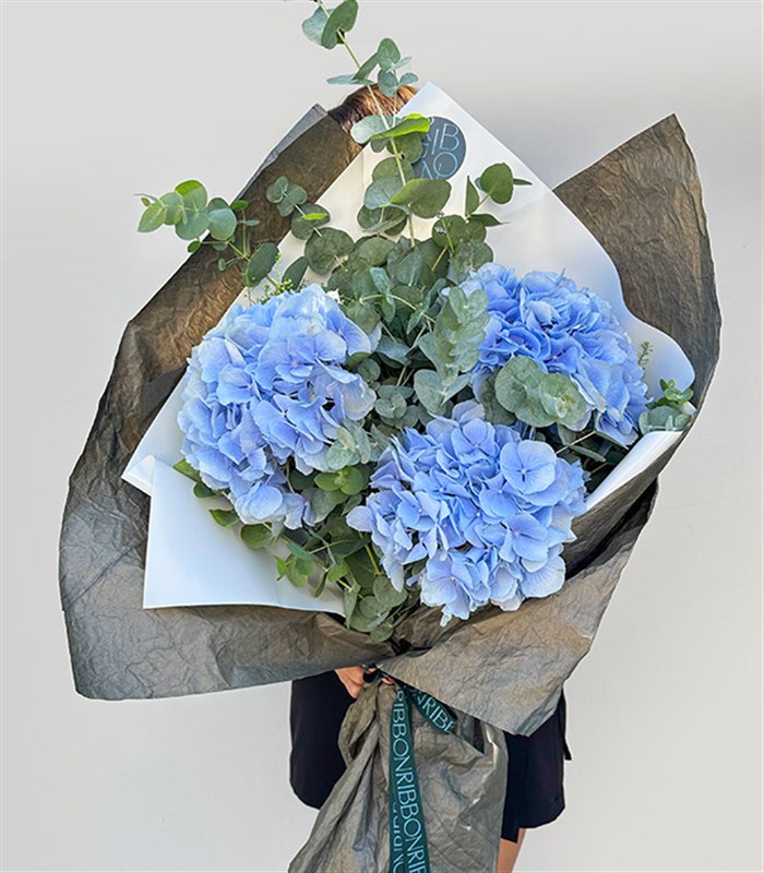 Buketimizin içerisinde 3 adet mavi ortanca, mis kokulu okaliptuslar ve traspi yeşilliği bulunmaktadır.