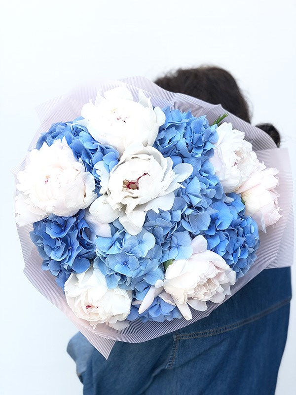 Bu gösterişli, göz alıcı beyaz şakayık mavi ortanca buketiyle onu şımartın!