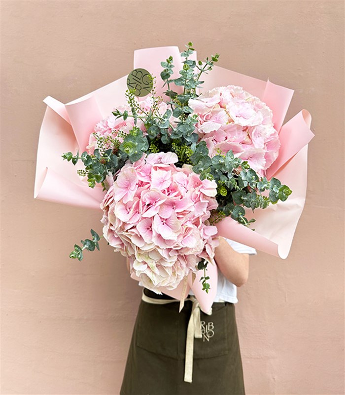 Buketimizin içerisinde 3 adet pembe ortanca, mis kokulu okaliptuslar ve traspi yeşilliği bulunmaktadır.
