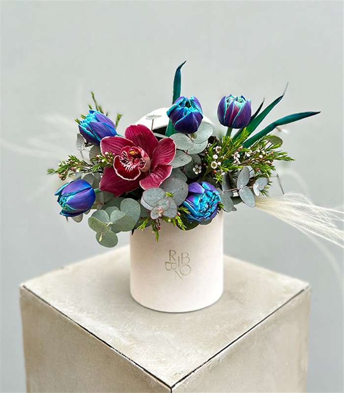 Mini boy krem kadife kutu içerisinde 5 adet galaksi lale, 1 adet bordo spidyum orkide ve mevsim yeşillikleri ile dizayn edildi.