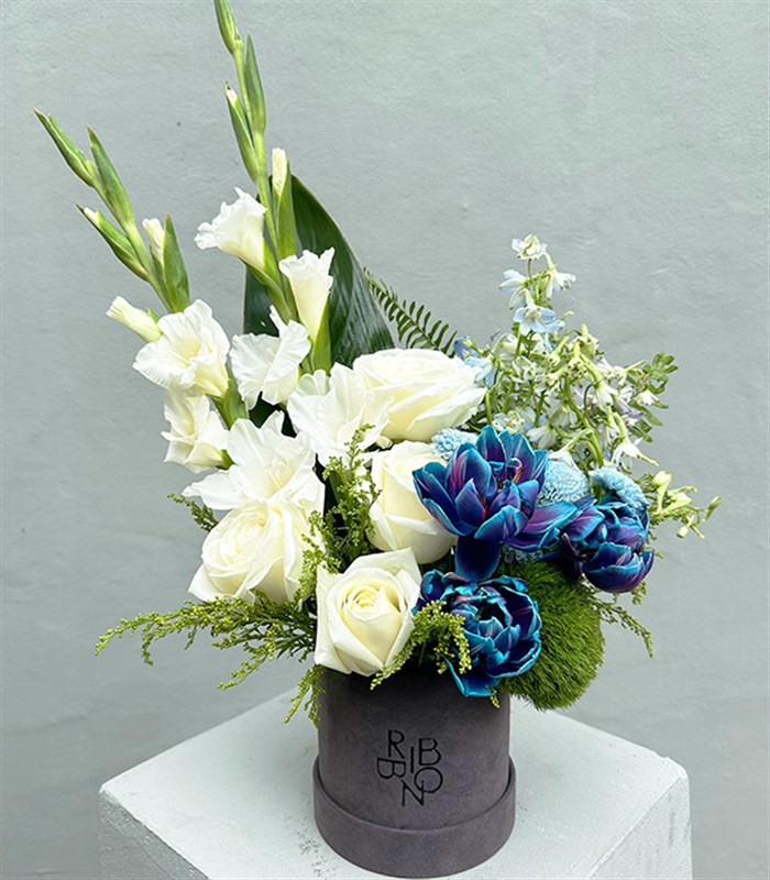 Mini Beyaz Mavi Galaksi Laleli Kutu Çiçek