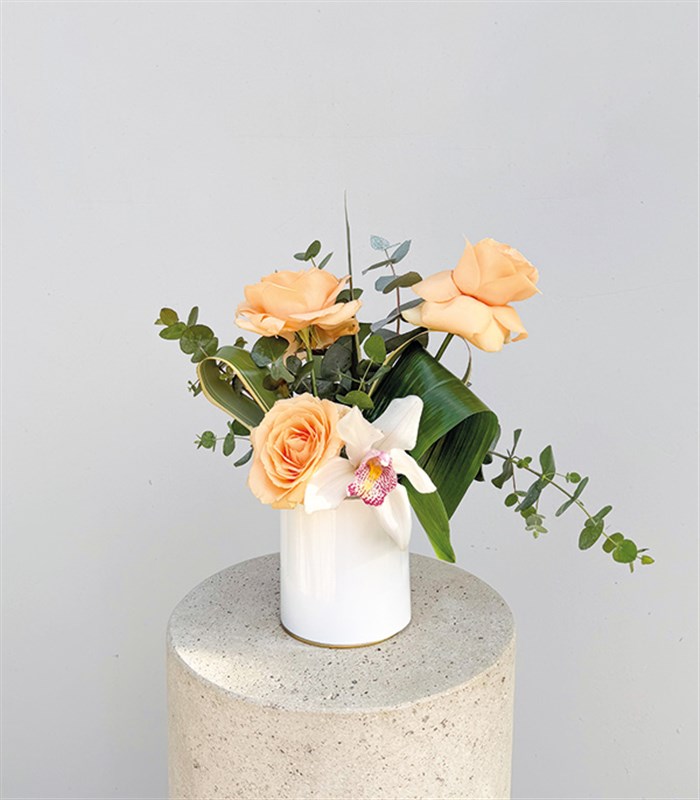 Kayısı güller, beyaz cymbidium orkide ile tasarlanmıştır.