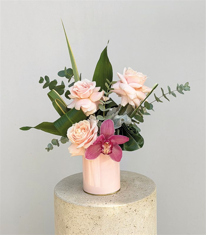 Pudra renkli mini vazo içerisinde 3 adet pembe ekvator gülü ve pembe cymbidium orkide ile tasarlanmıştır.