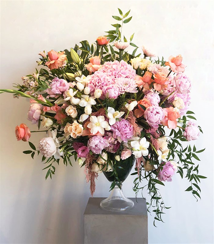 Cam ayaklı grand vazomuz içerisinde; toz pembe şakayıklar, beyaz laleler, somon ekvator gülleri, krem ekvator gülleri, pembe anastasyalar, lisiantuslar, mevsime özel çiçekler, yeşillikler ile dizayn edilmiştir.