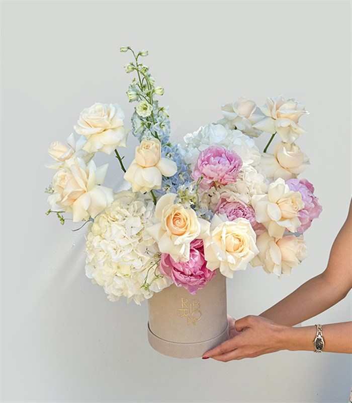 Opaline Deluxe Kutuda Beyaz Ortanca Pembe Şakayık Gül Aranjmanı