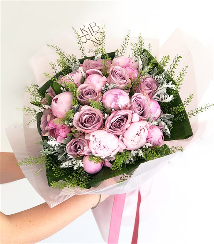 Lila güller ve toz pembe şakayıklarla, çok soft çok tatlı bir sevgililer günü çiçeği