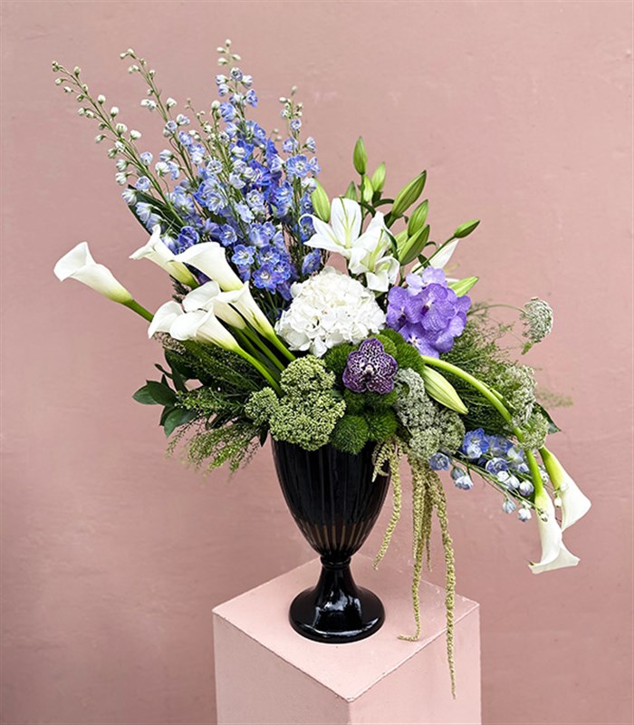 Grand Deluxe Siyah Vazoda Mavi Delfinyum Beyaz Ortanca Gala Aranjman