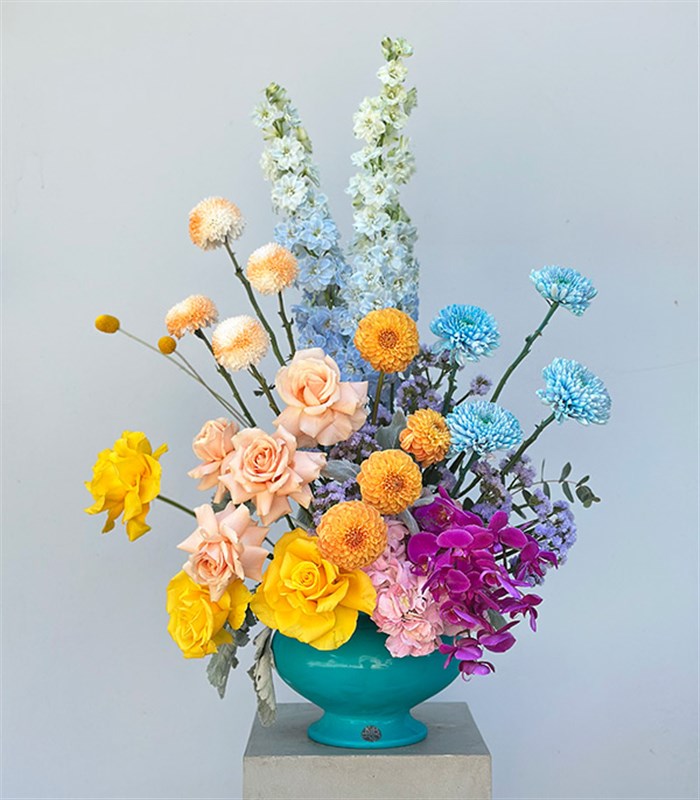 Turkuaz renkli seramik vazoda sarı ve kayısı rengi ekvator gülleri, özel renkleri ile mavi ve turuncu geçişli anastasyalar, pembe ortanca, fuşya orkide dalları, mavi ithal delfinyumlar, craspedialar ve mevsime özel kuru çiçekler, yeşillikler ile hazırlanmıştır.