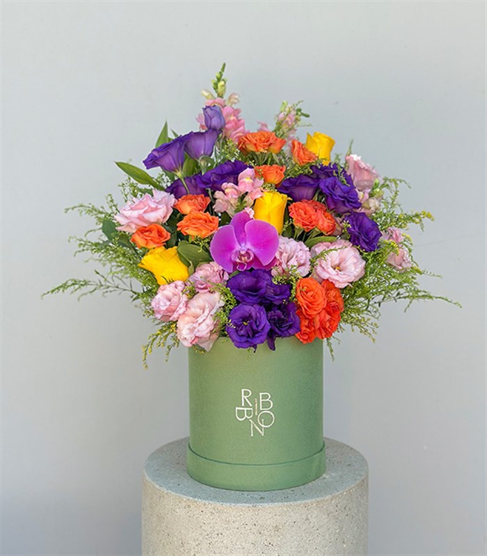 Yeşil kadife RIBBON kutuda mor ve pembe lisyantuslar, turuncu çardak gülleri, sarı güller, pembe aslanağzı ve soli yeşillikleri ile dizayn edildi.