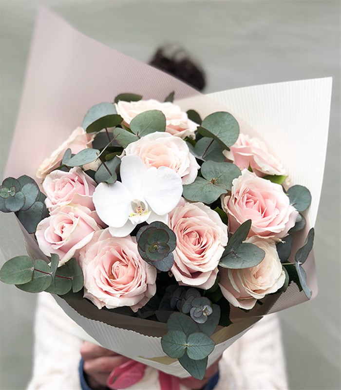 Enfes toz pembe ekvator güllerinin üzerine kelebek gibi konan beyaz orkide buketi.