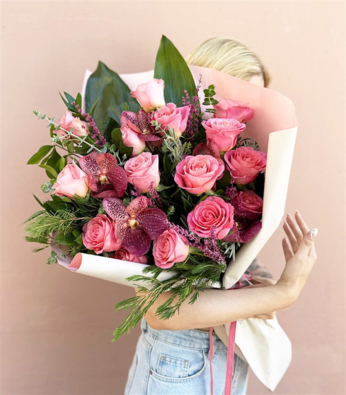 Buketin içinde 15 adet pembe ekvator gülü, 5 adet orkide, kır çiçekleri, okaliptus yaprakları, tüyler ve yeşillikler bulunmaktadır.