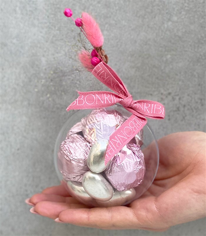 Pembe çikolata ve silver drajelerle dolu kuru çiçeklerle kurdele ile dizayn ettiğimiz orta boy küremizi, sepetinize ek ürün olarak ekleyerek sevdiklerinizi çok mutlu edebilirsiniz.